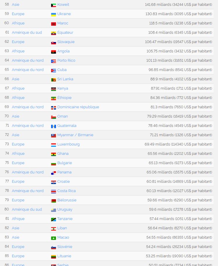 Ensuite, et comme promis, une liste non exhaustive de tous ces pays qui vivent avec un PIB annuel de moins de 134 milliards de dollars !
