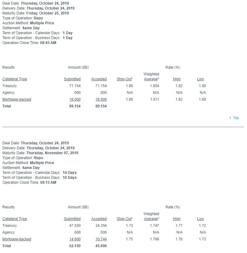 C’est ainsi que hier, rien que pour la journée du 24 octobre 2019, la FED a injecté 134 milliards de dollars ! Oui mes amis, 134 milliards !!!