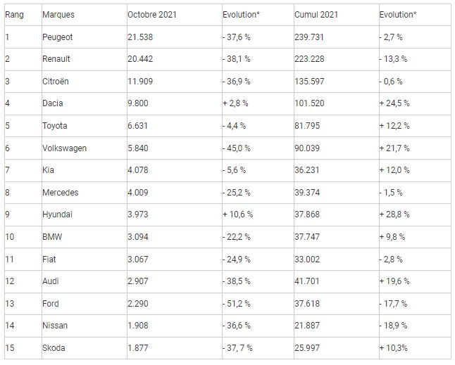 Une société comme Volkswagen connaît même un mois cauchemardesque, avec par exemple un – 45 % et Ford un  – 51 %. Seul Dacia s’en sort bien avec une hausse des ventes de 2,8 % ainsi que Hyundai, en progression de 10 % en octobre et de 29 % depuis le début de l’année, grâce au succès de son nouveau Tucson.