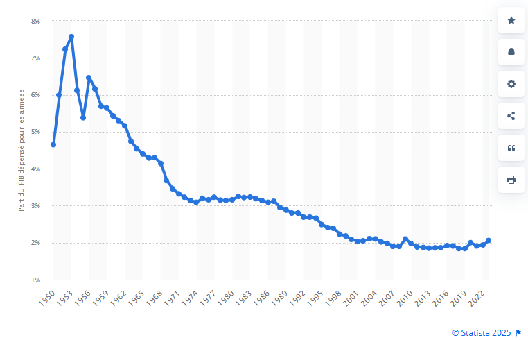 On va donc lui ressortir les statistiques sur les dépenses militaires dans le PIB français depuis 1950.