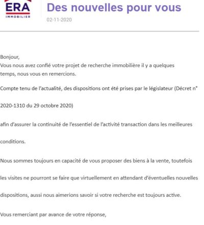 Voici ce que vient d’envoyer à ses clients cette agence immobilière Era qui respecte parfaitement la législation en vigueur puisque les agences immobilières peuvent proposer des visites virtuelles et faire signer des mandats ou des promesses de ventes dématérialisées également.