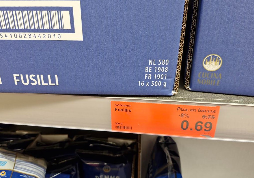 Par contre pour les pâtes, elles sont moins chères à Aldi en Belgique (0,55 ctes les 500 gr)