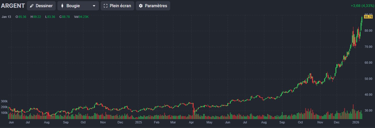 L’argent monte encore de plus de 8 % dans la séance d’hier et poursuit sa route vers la barre symbolique des 100 $ l’once, niveau qui devrait provoquer une correction brutale et significative sur ce métal.