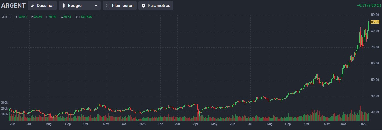 Les cours de l’argent viennent de battre de nouveaux records avec une hausse de presque 10 % en une seule journée à plus de 85 dollars américains l’once d’argent.
