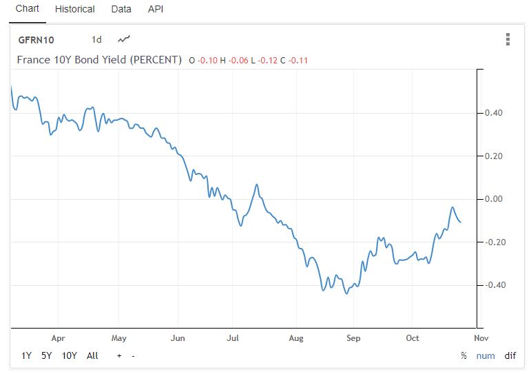 Comme vous pouvez le voir lorsque la BCE a annoncé que ses taux allaient passer de -0.40 à -0.5 % les taux ont commencé à remonter et ils sont de -0.11% au moment où j’écris ces lignes.