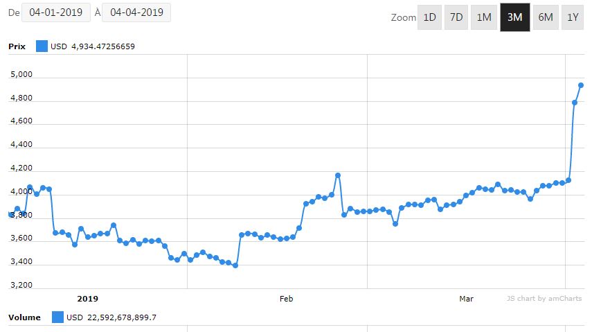 « Les motifs du ‘rally’ sont peu évidents. Certains ‘experts’ bassement pragmatiques évoquent des aspects essentiellement techniques, après le débordement à la hausse des 4.200$ sur BTC. Bloomberg fait état de son côté d’un poisson d’avril d’un site d’information, selon lequel la Securities & Exchange Commission, gendarme boursier et financier américain, aurait approuvé des ETF (‘exchange-traded funds’) en Bitcoin.