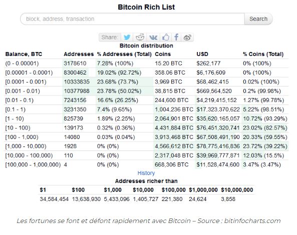 Comme on peut le voir sur le tableau de BitInfoCharts ci-dessous, il n’y a désormais plus que 24 624 adresses Bitcoin qui comportent pour plus d’1 million de dollars de la cryptomonnaie. Or, comme le rappelle notamment Cryptopotato, il y avait près de 100 000 adresses comportant une somme équivalente il y a tout juste 1 an, en janvier 2022.