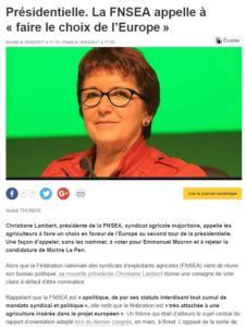 La cheftaine de la FNSEA donc appelait de manière fort grandiloquente à « faire le choix de l’Europe », ce qui voulait dire à voter Macron lors des présidentielles.