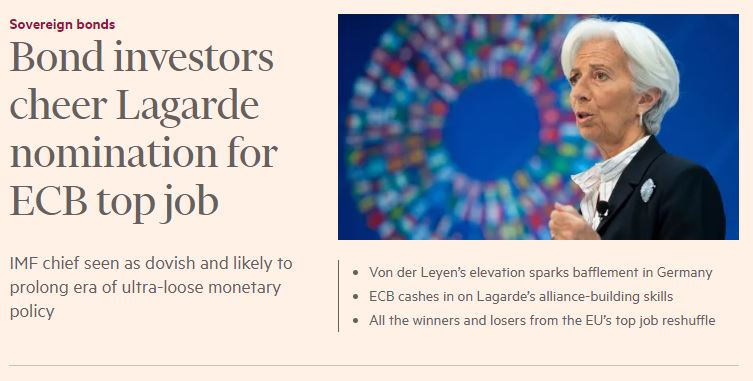 Dans le contexte actuel, le choix de Christine Lagarde est le meilleur choix pour la BCE. Regardez cet article du Financial Times intitulé: « Les investisseurs obligataires se réjouissent de la nomination de M. Lagarde à la tête de la BCE . Le chef du FMI considéré comme dovish et susceptible de prolonger l’ère de l’assouplissement de la politique monétaire »