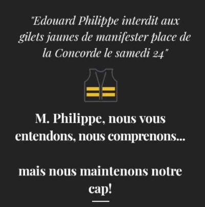 Sinon sur les réseaux sociaux, il semblerait que côté gilets jaunes, le maintien de cap du gouvernement est une notion bien comprise… Je rappelle que participer à une manifestation non autorisée est illégal et qu’en aucun cas il ne faut le faire blablablablabla… Respectez la loi blablablablabla et en toutes circonstances, préservez la vie !!!