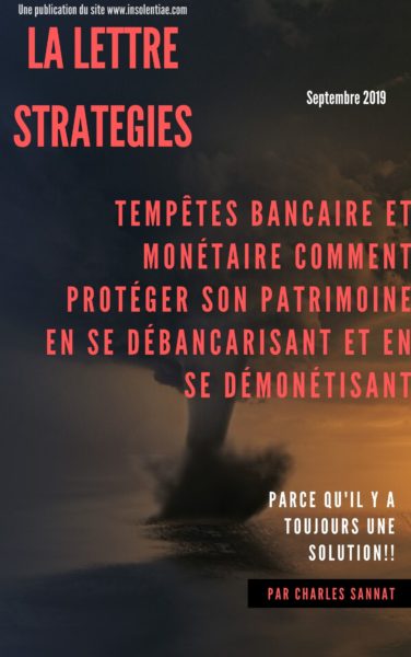 En attendant soyez prêts à agir dans l’urgence pour répartir vos fonds comme je vous l’ai expliqué dans le dernier flash Stratégies. N’oubliez pas non plus de relire le dossier de Septembre 2019 cruellement d’actualité intitulé « Tempêtes bancaire et monétaire, comment protéger son patrimoine en se débancarisant et en se démonétisant ». Pour ceux qui veulent s’abonner tous les renseignements sont ici.