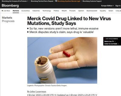C’est un article de Bloomberg, une agence de presse pas franchement complotiste qui revient sur une étude qui montre que la pilule Merck anti-covid conduit en réalité à créer des virus mutants qui pourraient potentiellement être plus dangereux ou en tous cas échapper à l’immunité qui se développe vague après vague.