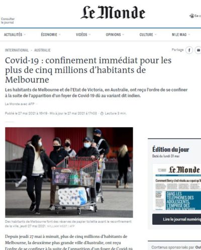 Quant à Melbourne en Australie, ce n’est pas mieux, et les 5 millions d’habitants sont totalement reconfinés pour une période de quelques jours dans le cadre de la stratégie australienne du zéro covid, et là bas, quand ça confine, ça confine très sérieusement.