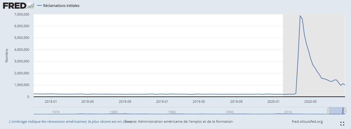Ces créations d’emplois doivent être également mises en perspective avec les nouvelles inscriptions au chômage. La dernière semaine connue d’août, il y a eu plus d’un million d’inscriptions en seulement une semaine comme vous pouvez le voir sur le graphique ci-dessous contre seulement 428 000 création pour tout le mois d’août dans le secteur privé. Nous sommes dans un rapport de 1 à 10.