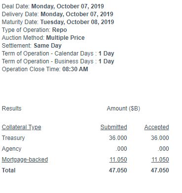 La crise du Repo n’en finit pas de se terminer. Alors que les injections avaient fortement diminué avec un point bas le 3 octobre et « seulement » 33.5 milliards de dollars demandés, nous sommes remontés à 38.5 milliards le 4 octobre, puis à 47 milliards le lundi 7 octobre comme vous pouvez le voir sur ce compte-rendu de la FED.