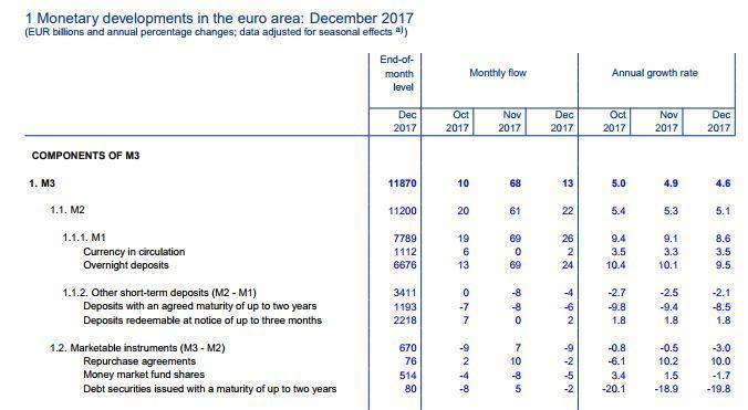 Or si l’inflation est faible, vous pourrez constater, sur ce tableau de la BCE elle-même donc évidemment une source totalement officielle, que l’on augmente notre masse monétaire de 5 à 10 % en fonction de l’agrégat que l’on prend en compte. 5 % pour M3 et 10 % de croissance pour M1.