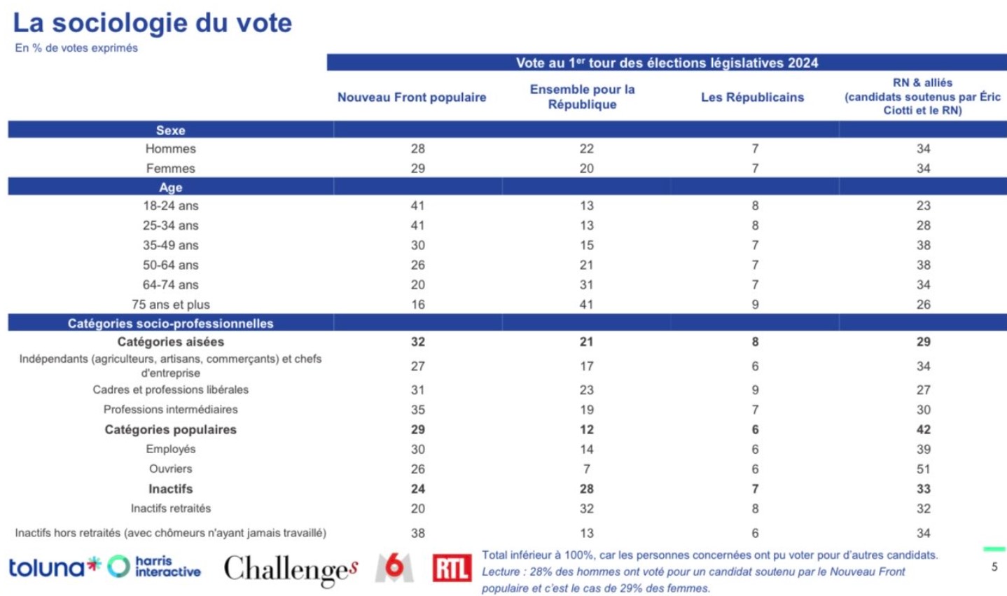 La sociologie du vote à ce premier tour des législatives 2024 est absolument fascinante et disons-le également très stéréotypée même si vous le savez il faut « lutter » contre les stéréotype mais ils ont la peau dure !