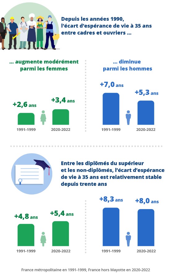 Dans les conditions de mortalité de 2020-2022, les hommes cadres de 35 ans vivent en moyenne 5,3 ans de plus que les ouvriers. Chez les femmes, cet écart est moins marqué (3,4 ans). Les ouvriers ont plus de deux fois plus de risque que les cadres de mourir entre 35 et 65 ans, et 1,7 fois plus entre 65 et 75 ans. Depuis les années 1990, l’écart d’espérance de vie entre les cadres et les ouvriers a diminué pour les hommes (-1,7 an), alors qu’il a augmenté modérément pour les femmes (+0,8 an).