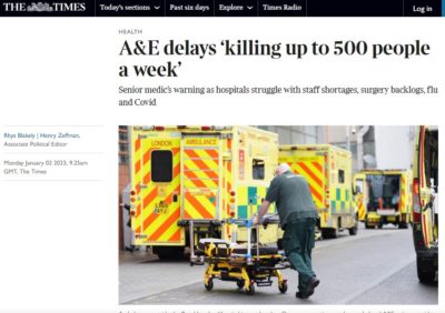 « Nous pensons qu’entre 300 et 500 personnes meurent chaque semaine des suites de retards et de problèmes liés aux soins d’urgence », a-t-il déclaré à Times Radio.
