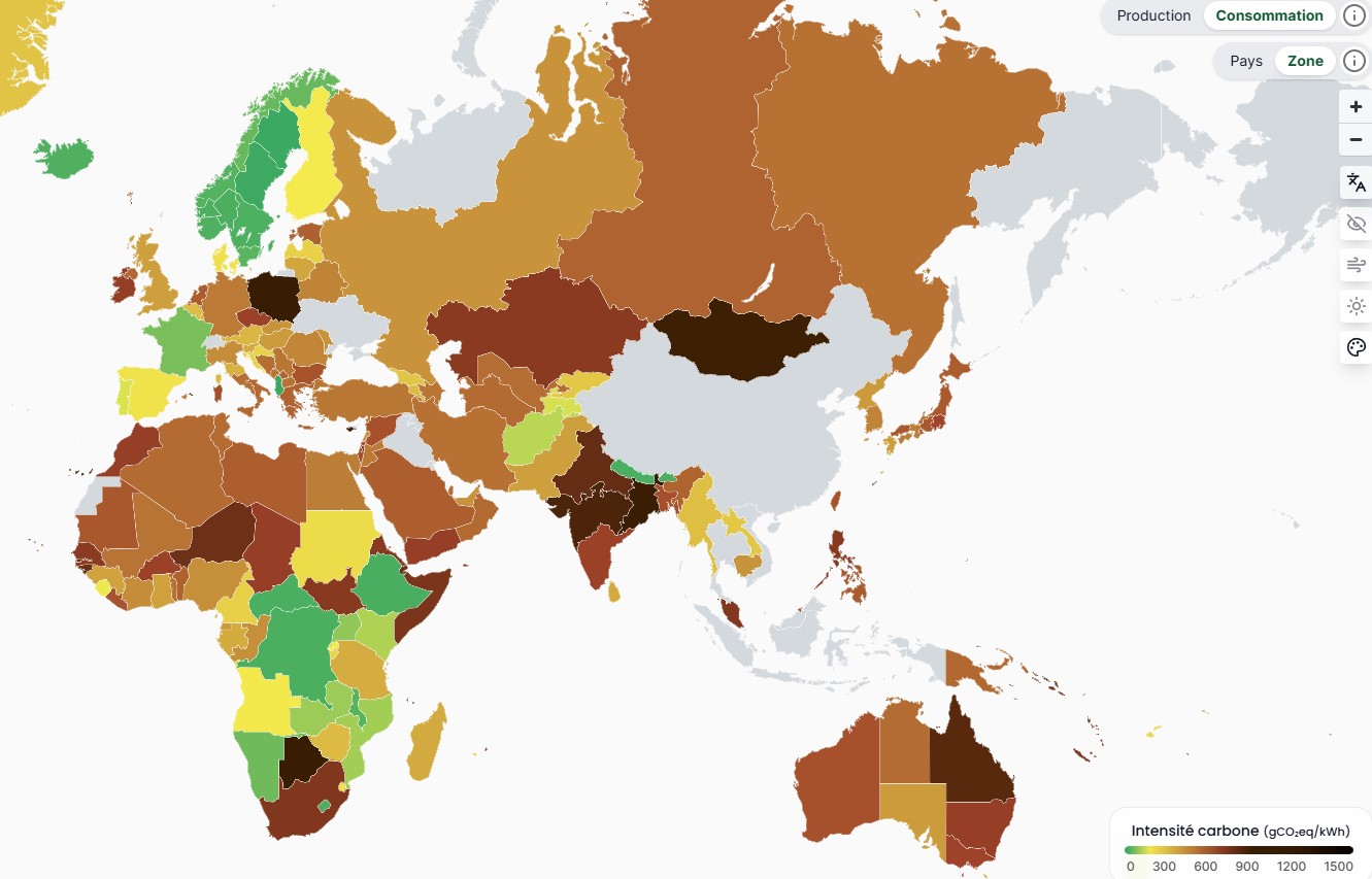 Plus c’est marron plus c’est du charbon avec plein de CO2 et les pays de l’est à commencer par notre aimable voisin allemand polluent comme des petits cochonnets en demandant à la France dépenser encore plus d’argent pour décarboner une énergie nucléaire qui l’est déjà… Nous, c’est vert, parce que notre énergie est propre (même si elle est radioactive, elle ne fait de CO2). Source Electricity Map ici.