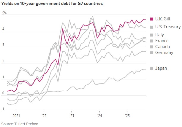 Le Royaume-Uni voit ses coûts d’emprunt atteindre des niveaux inédits depuis les années 1990, alimentant les inquiétudes quant à la soutenabilité de sa trajectoire budgétaire. Bien que les économistes ne parlent pas encore de crise imminente, le pays pourrait jouer le rôle de « canari dans la mine de charbon » pour d’autres économies avancées lourdement endettées, comme la France ou les États-Unis… car le WSJ pointe bien le problème des dettes mondiales !