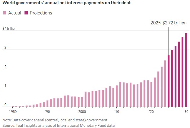 Vous avez aussi ce graphique qui montre que les intérêts, uniquement les intérêts payés par les Etats sont de 2 720 milliards de dollars pour l’année 2025 ce qui fait l’équivalent du PIB de la France payé uniquement en intérêt. Effectivement, la dette des Etats est un vol en bande organisée.