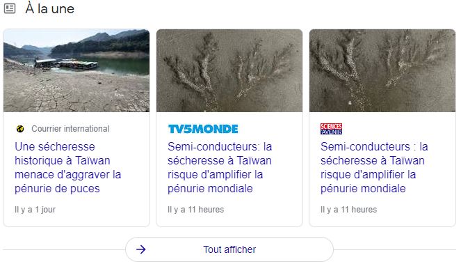 Oui ça coince, parce que les usines made in Taiwan patinent et cela va s’aggraver car il n’y a plus assez d’eau… oui de l’eau. C’est la sécheresse là-bas, et la presse en tremble déjà et nos industriels paniquent…