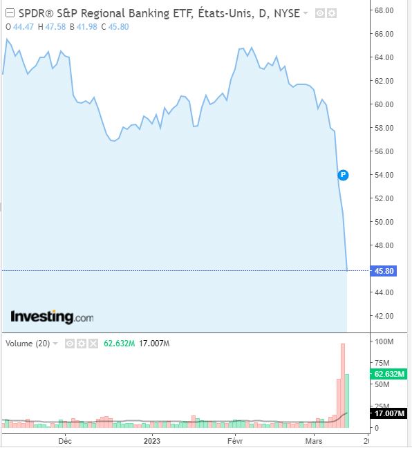 Enfin dernière chose avant de vous quitter. Quand Bruno Le Maire vous explique qu’il n’y a pas de risque de « contagion » il sait très bien qu’il ment et la contagion est déjà en train de se faire. A Bercy aussi on peut suivre l’indice trackers des banques régionales américaines. Et il s’effondre alors que les volumes de ventes, eux, explosent (les petites barres rouges tout en bas du graphique).
