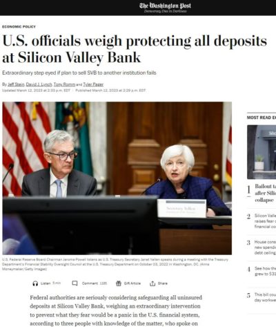 « Les autorités fédérales envisagent sérieusement de protéger tous les dépôts non assurés de la Silicon Valley Bank, à travers une intervention extraordinaire pour empêcher ce qu’elles craignent d’être une panique dans le système financier américain, selon trois personnes au courant de l’affaire, qui se sont exprimées sous couvert d’anonymat.