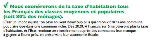 Mon propos n’est pas de vous faire peur, mais de vous préparer, car c’est en sachant les choses qu’on peut mieux les gérer.CE QUE L’ON VOITToujours fidèle à mon approche factuelle, je note que le candidat Emmanuel MACRON avait annoncé dans son programme électoral, l’exonération de la taxe d’habitation (TH) pour 4 Français sur 5 dès 2020, très précisément en haut de la page 29 du programme :