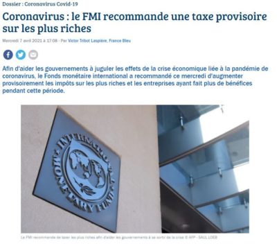 L’idée du FMI comme vous pouvez le voir sur cet article de France Bleu c’est de mettre une taxe provisoire sur les riches.