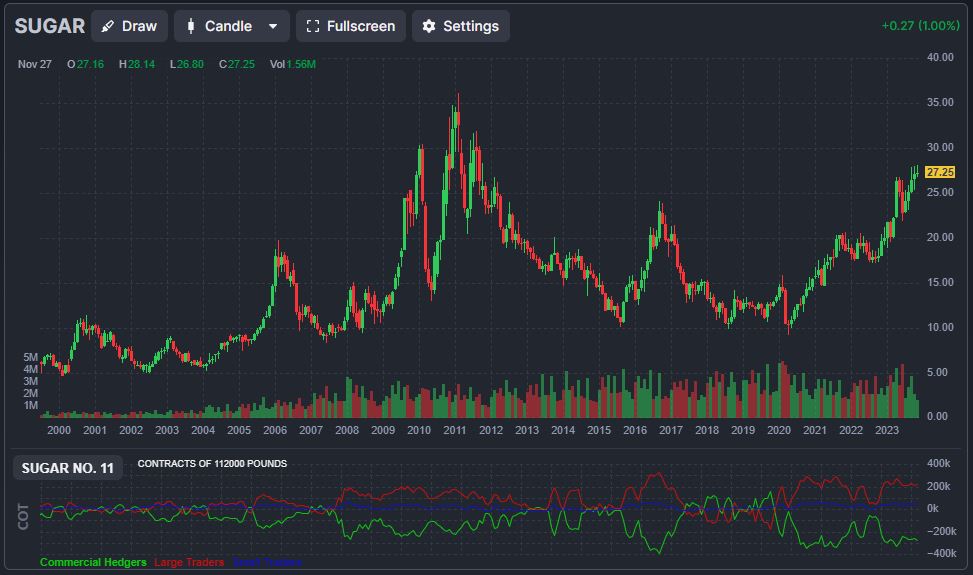 « Coté sur le marché à terme à New York, le cours du sucre est au plus haut depuis 2011, et a même doublé depuis 2020. Avec une livre de sucre autour de 27 centimes de dollars, soit 35% de hausse depuis le début de l’année, faisons-nous fasse à une spéculation sur la poudre blanche ? Réponse avec Charles Sannat, fondateur du site insolentiae. Ecorama du 27 novembre 2023, présenté par David Jacquot sur Boursorama.com » Voilà pour le résumé rapide.