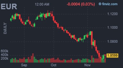 Ci-dessous les cours de l’euro face au dollar…. je ne vous cache pas que ça baisse… mais je ne vous apprends rien puisque cela se voit comme le graphique au milieu de la figure !