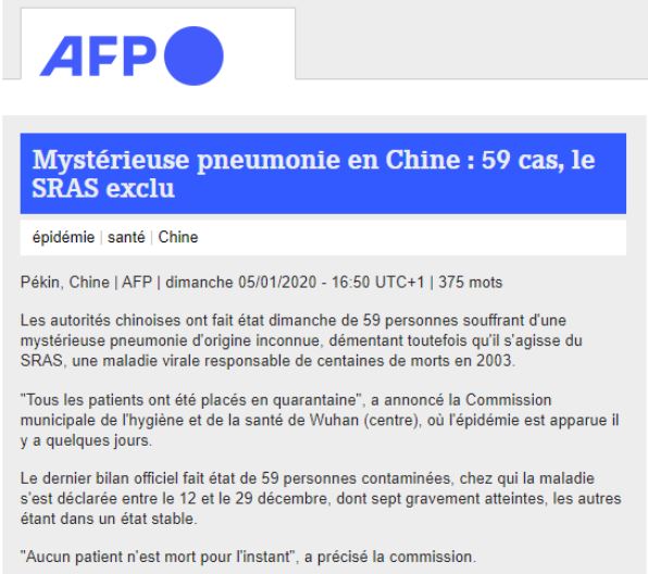 Voici la première dépêche un y a deux ans de l’AFP qui nous annoncait une pneumonie en Chine, dans une ville peu connue du grand public, Wuhan.
