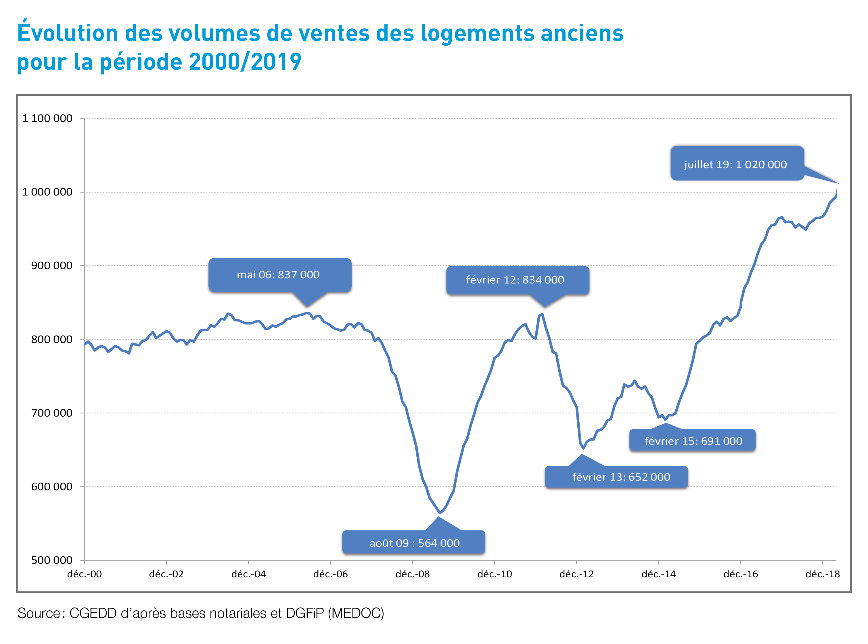 Comme nous l’apprennent les Notaires de France dans leur dernière lettre,  « avec 1 020 000 transactions réalisées sur douze mois à fin juillet 2019 (+ 7% sur un an), le volume annuel des transactions confirme le dynamisme exceptionnel du marché immobilier. Il est supérieur à celui cumulé sur un an le trimestre précédent (984 000 à fin mars), ainsi qu’à celui constaté un an plus tôt (953 000). Néanmoins, pour autant que ce record historique ait valeur d’étalon dans les années à venir, la proportion de ventes reste équivalente aujourd’hui à celle du début des années 2000, si on la rapporte au stock de logements disponibles qui augmente d’environ 1 % par an. De manière générale, les notaires ne constatent actuellement aucun affaiblissement de la dynamique, les volumes ne devraient donc pas baisser dans les mois à venir ».