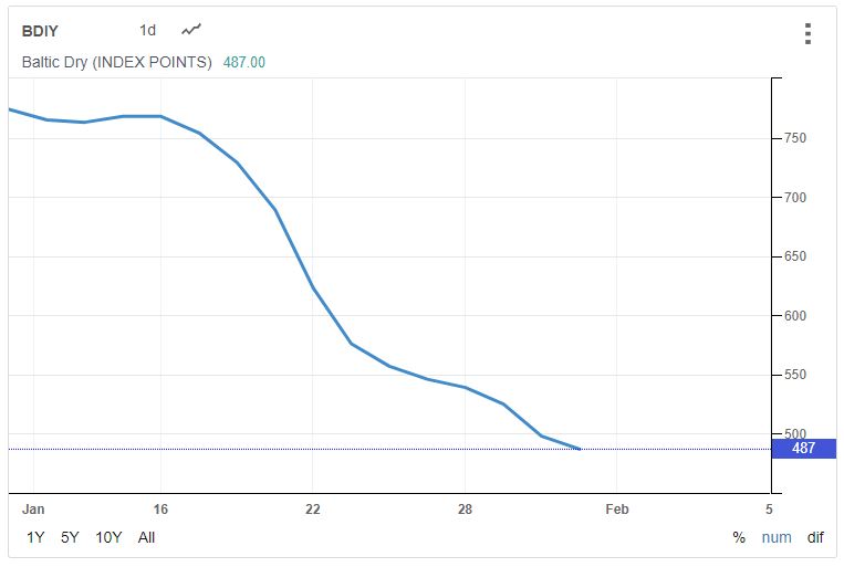 L’indice du fret appelé Baltic Dry Index, et qui n’est qu’un indicateur parmi les autres, s’effondre depuis début janvier 2020.