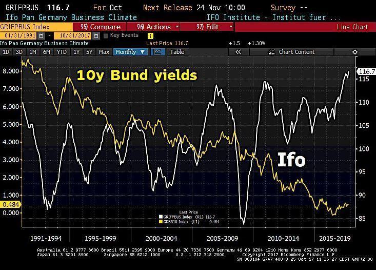 Ce qui est intéressant c’est que le Holger Zschäpitz, journaliste économique vedette du Welt en Allemagne (un quotidien), s’est « amusé » récemment, c’est-à-dire hier, à comparer cet indice du climat des affaires, le fameux IFO, avec les évolutions de la courbe des taux.