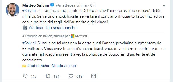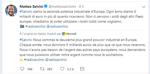 Dans le premier il explique que l’Italie paye 6 milliards de plus qu’elle n’en reçoit de l’Union Européenne ce qui est vrai et que l’Italie est la deuxième puissance industrielle européenne (devant la France soit dit en passant) ce qui est vrai aussi, et qui a pour conséquence que l’Italie, évidemment ne manque pas d’atouts. Il n’y a aucune raison objective à la « soumission » italienne qui pourrait prendre fin prochainement !