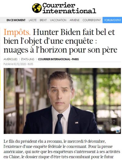 Quant à Courrier International, le titre est sans ambiguïté, c’est une sacrée tuile et une belle épine dans les pieds déjà douloureux et tordu6 de Biden père, ce dernier s’étant plus ou moins cassé la cheville en jouant avec son chien.