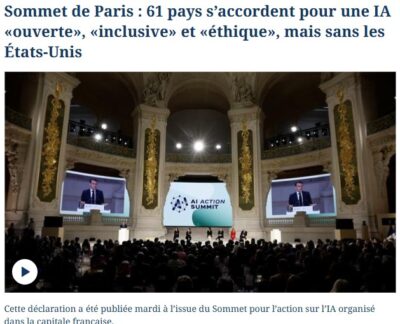 « Les États-Unis et le Royaume-Uni ne figurent pas parmi les 61 premiers pays signataires de la déclaration pour une intelligence artificielle (IA) «ouverte», «inclusive» et «éthique» publiée mardi à l’issue du Sommet pour l’action sur l’IA à Paris. Les signataires, qui incluent la Chine, la France et l’Inde, se sont aussi prononcés pour une coordination renforcée de la gouvernance de l’IA nécessitant un «dialogue mondial» et ont appelé à éviter «une concentration du marché» afin que cette technologie soit plus accessible. »