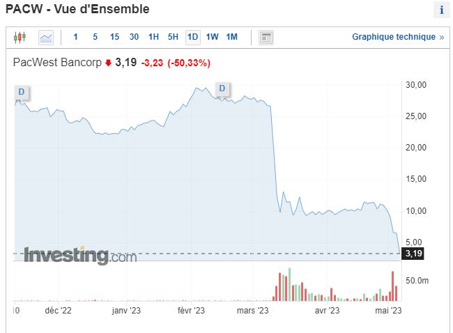 Aux Etats-Unis c’est la Bérézina bancaire et la chute en bourse de la banque PacWest relance les spéculations de craintes sur les banques régionales américaines.