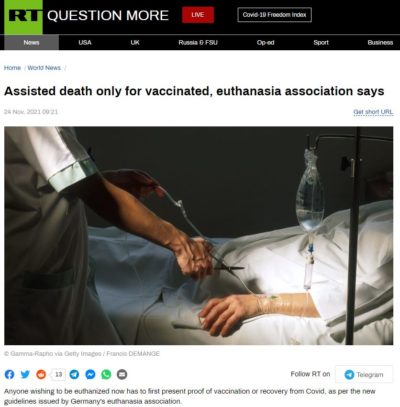 « Toute personne souhaitant être euthanasiée doit désormais présenter d’abord une preuve de vaccination ou de rétablissement de Covid, conformément aux nouvelles directives émises par l’association allemande d’euthanasie ».