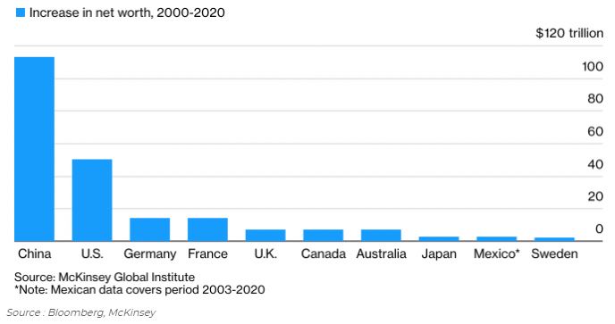 Selon le rapport, la richesse mondiale a triplé au cours des deux dernières décennies, citant McKinsey, la Chine ouvrant la voie et remplaçant les États-Unis pour la première étape mondiale.