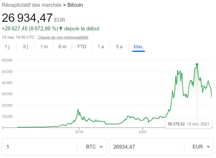 On peut aussi dire que depuis son point haut de 56 278 euros atteint le 12 novembre 2021, le Bitcoin ne vaut plus « que » 26 934 euros au moment où j’écris cet article.