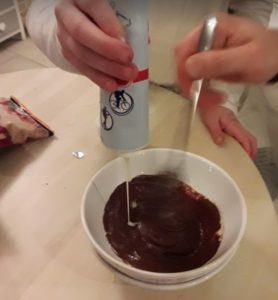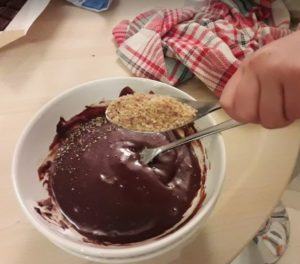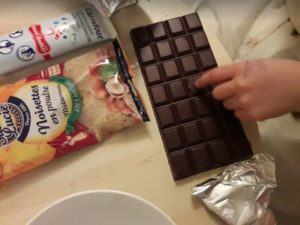 2/ Profitez-en pour faire réviser les problèmes de math à celle de 8 ans, qui découvre comment on divise 200 grammes par deux vu qu’il faut 100 g de chocolat et que la tablette en fait 200 alors on compte les carrés… Pas gagné mais on y arrive !