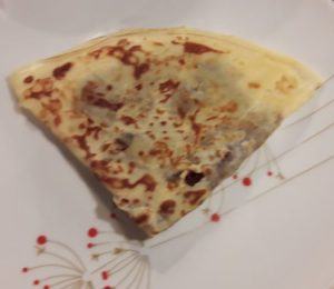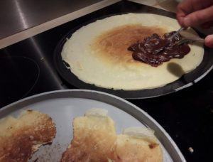 5/ Demandez au papa que je suis de faire cuire les crêpes, mais ne demandez pas à l’économiste de faire sauter les crêpes… Essai raté de la poêle d’en bas… Bon, tartinée, cela se mangera, rassurez-vous pour cette pauvre crêpe. Étalez votre pâte à tartiner faite maison et avec amour par vos enfants qui sont très fiers de leur œuvre. Profitez-en pour les féliciter et « travailler » l’estime de soi qu’ils peuvent avoir, car comme dit notre docteur, « si ce n’est pas vous qui leur faites des compliments, personne ne le fera… » (Pas bête le docteur.)