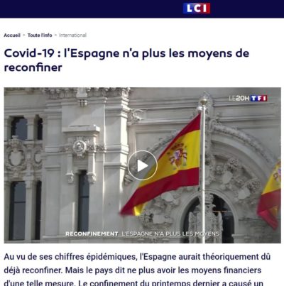 Voici ce que dit cet article de LCI. « Au vu de ses chiffres épidémiques, l’Espagne aurait théoriquement dû déjà reconfiner. Mais le pays dit ne plus avoir les moyens financiers d’une telle mesure. Le confinement du printemps dernier a causé un désastre économique ».
