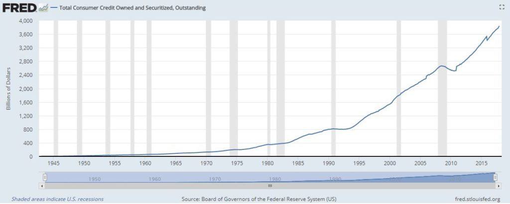 Comme vous pouvez le voir sur le graphique ci-dessous, qui est issu de la base de documents de la Réserve Fédérale américaine elle-même, avec 3 840 milliards de dollars, jamais les crédits à la consommation n’ont été aussi monstrueusement élevés en montants cumulés.