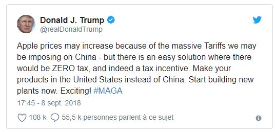 « Donald Trump a déclaré samedi dans un tweet que «les prix d’Apple pourraient augmenter en raison des énormes droits de douane que nous allons peut-être imposer à la Chine – mais il existe une solution simple où il y aurait ZÉRO impôt et même une incitation fiscale. Fabriquez vos produits aux États-Unis plutôt qu’en Chine. Commencez à construire de nouvelles usines maintenant. »