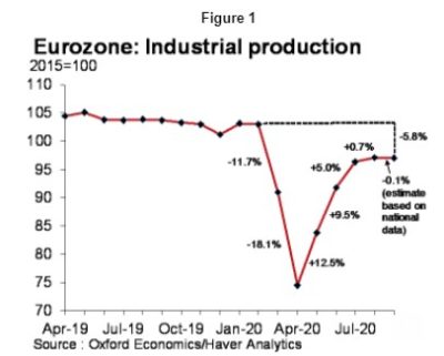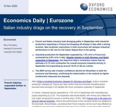« L’industrie française et italienne ont pris des chemins divergents en septembre. La production industrielle s’est développée en France, mais a fortement chuté en Italie après un fort été. De nouvelles restrictions de verrouillage dans les deux économies vont freiner les performances industrielles au quatrième trimestre, mais dans une bien moindre mesure qu’au printemps.